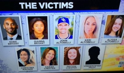 Список погибших: Коби Брайант (41 год), Джанна Брайант (13), Джон Алтобелли (56), Кери Алтобелли, Алисса Алтобелли, Сара Честер, Пэйтон Честер (13), Кристина Маузер и Ара Зобаян.
