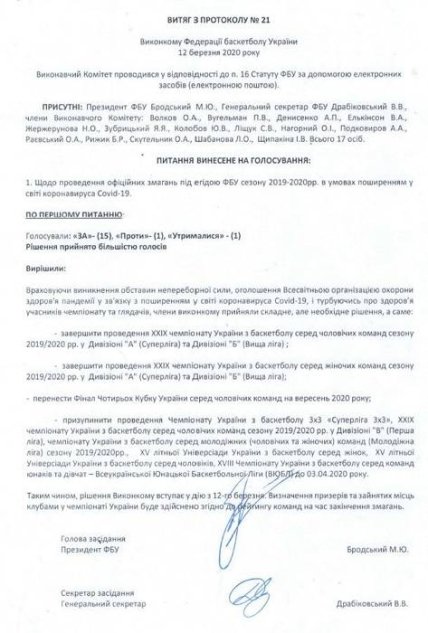 Федерация баскетбола Украины приняла тяжелое решение, касаемо завершения сезона в чемпионата Украины в мужских и женских дивизионах А (Суперлига) и Б (Высшая лига).