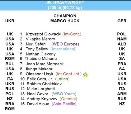 Чемпионом мира в супертяжелом весе по версии WBO является украинец Владимир Кличко, а Вячеслав Глазков занимает 11-е место.