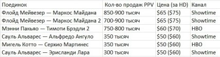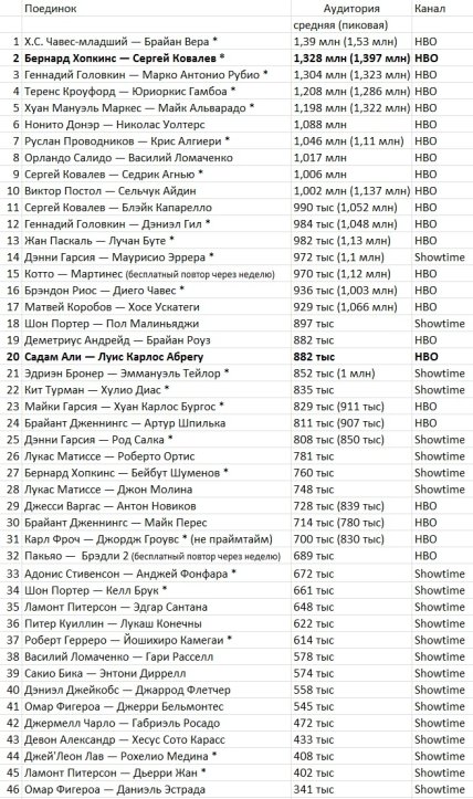 Аудитория бесплатно транслировавшихся поединков на HBO и Showtime в 2014 году. Звездочкой отмечен главный бой вечера.