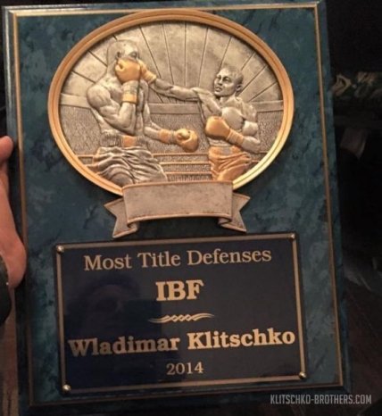 Чемпион мира в супертяжелом весе по версиям IBF, WBA, WBО, IBO и журнала "The Ring Magazine" Владимир Кличко получил награду Международной Федерации Бокса (IBF) за самое большое количество защит своего чемпионского титула в 2014 году. Об этом сообщает официальный сайт братьев Кличко.