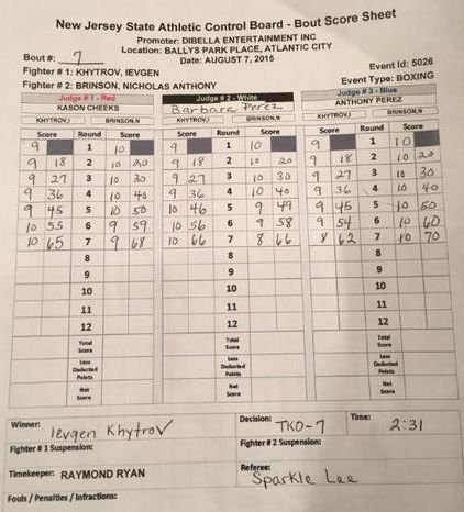 Сегодня утром в Нью-Джерси, США украинец Евгений Хитров (11-0, 10 КО) техническим нокаутом в восьмом раунде победил американца Ника Бринсона (17-4-2, 7 КО). По обычаю, судьи после боя показывают свои карточки, на которых был счет поединка.