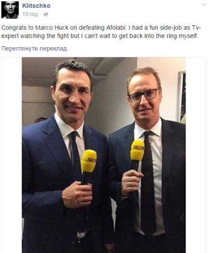 "Поздравляю Марко Хука с победой над Афолаби. У меня была интересная дополнительная работа в качестве TV-эксперта, который наблюдает за боем. Но я не могу дождаться, чтобы вернуться на ринг самому", - написал В.Кличко.