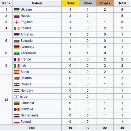 На втором месте медального зачета расположились россияне с пятью медалями (2 золота, 2 серебра и 1 бронза), третьими стали британцы с 8-ю медалями (1 золото, 6 серебрянных и 1 бронза).