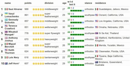 По среднему количеству набранных баллов за один бой Ломаченко далеко впереди своих конкурентов за звание лучшего боксера мира вне зависимости от весовой категории. Каждая победа приносит украинцу в среднем по 86 пунктов, что больше, нежели у Альвареса, Головкина и Кроуфорда вместе взятых.
