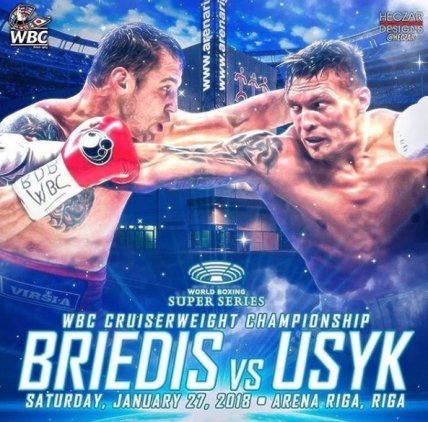Бой Усика (чемпион WBO) и Бриедиса (чемпион WBC) начнется в 23:00 по киевскому времени и пройдет в рамках полуфинала Всемирной боксерской суперлиги на "Арене Рига".