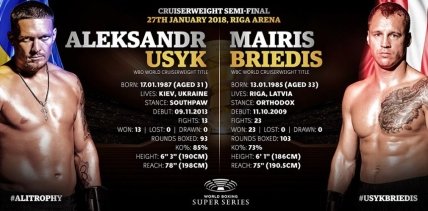 В субботу, 27 января, в Риге прошел полуфинальный бой Всемирной боксерской суперсерии в тяжелом весе. На ринге – чемпион мира по версии WBO украинец Александр Усик и чемпион мира по версии WBC латвиец Майрис Бриедис.