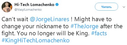 Ломаченко бросил вызов именитому боксеруЛомаченко не растерялся и довольно быстро отреагировал в Twitter: "Жду с нетерпением, Линарес. Возможно, после нашего боя тебе придется сменить никнейм на #TheJorge (вместо #TheKingJorge). Ты больше не будешь королем", - написал украинец, добавив хэштег #KingHiTechLomachenko.
