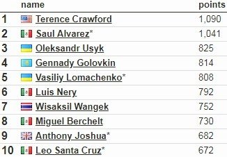 Абсолютной чемпион мира в крузервейте (тяжелом весе) Александр Усик занял четвертое место рейтинга P4P - лучших боксеров вне зависимости от весовой категории по версии журнала The Ring.
