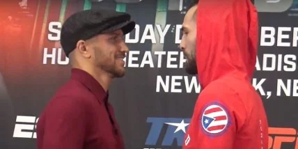 Уже завтра в Нью-Йорке украинец Василий Ломаченко проведет объединительный бой в легком весе против Хосе Педрасы из Пуэрто-Рико. На кону поединка будут стоять пояс WBA Василия и пояс WBO Хосе. Накануне главного боя вечера бокса Ломаченко и Педраса встретились лицом к лицу.