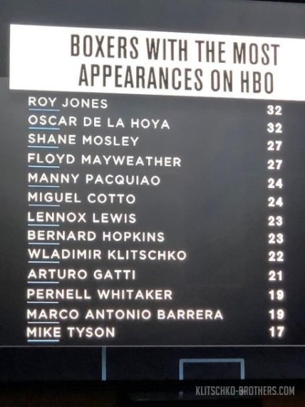 Всего бои украинца на телеканале транслировались 22 раза – это больше, чем поединки Майка Тайсона и Артуро Гатти. К примеру, бои с участием Леннокса Льюиса на НВО транслировались 23 раза. Чаще всего канал показывал поединки Роя Джонса и Оскара Де Ла Хойи – по 33 боя.