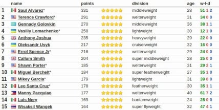 Лидирует в рейтинге мексиканец Сауль Альварес, сместивший американца Теренса Кроуфорда. Чемпион мира по версиям WBA/WBO/IBF/IBO в супертяжелом весе британец Энтони Джошуа поднялся с 9-го на 5-е место. Американец Эррол Спенс-младший, который раньше вообще не находился в десятке лучших, занял 7-ю позицию. Это же касается и британца Каллума Смита с американцем Шоном Портером, которые смогли ворваться в ТОП-10.