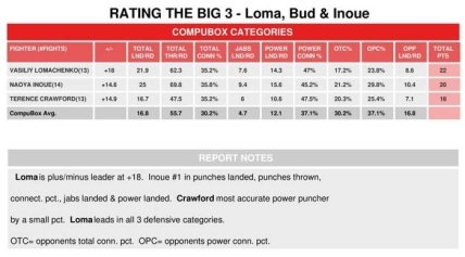 Статистический портал CompuBox сравнил между собой украинского чемпиона WBA и WBO в легком весе Василия Ломаченко, обладателя титула по версии WBO в полусреднем дивизионе американца Теренса Кроуфорда, а также японского владельца пояса IBF в легчайшем весе Наою Иноуэ.