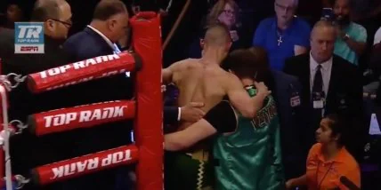 В Сети появилось видео, на котором видно, как тренер боксера первого полусреднего веса Максима Дадашева Бадди Макгирт упрашивает подопечного остановить бой.