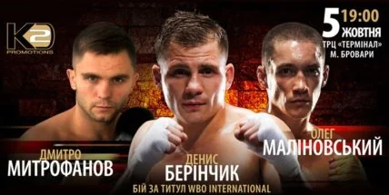 Сегодня, 5 октября, в Броварах в ТРЦ "Терминал" состоится большой вечер профессионального бокса компании K2 Promotions. В главном бою вечера выступит непобежденный украинский легковес Денис Беринчик.