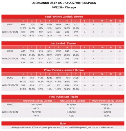 За 7 раундов Усик выбросил 347 ударов, из них 139 точных. Уизерспун выбросил 208 ударов, но в цель попал только 21. Также у Усика впечатляющая точность в мощных ударах. Из 123-х ударов в цель пришло 86 - это 70% точности.