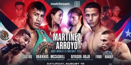 Отметим, в Талсе состоится два чемпионских поединка. В главном бою вечера бокса сразится чемпион WBC в наилегчайшем весе мексиканец Хулио Сезар Мартинес и пуэрториканец Маквильямса Арройо (20-4, 15 КО).