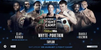 Через четыре недели состоится боксерское шоу промоутерской компании Matchroom Boxing Fight Camp 4. Возглавит вечер бокса, который состоится в штаб-квартире Matchroom, бой опытнейших тяжеловесов британца Диллиана Уайта и россиянина Александра Поветкина. На кону поединка будет стоять пояс временного чемпиона WBC, которым владеет Уайт. Ожидается, что победитель схватки выйдет на титульный бой по линии Совета против победителя противостояния Фьюри - Уайлдер 3.