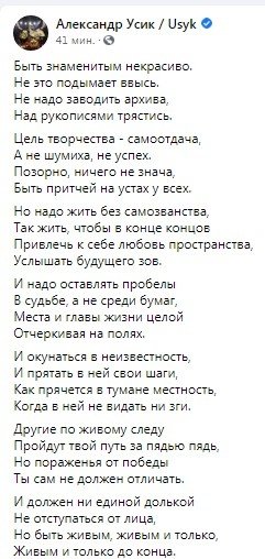 После поединка Усик опубликовать пост на своей страничке в facebook, процитировав стих русского поэта Бориса Пастернака. Также Александр прикрепил совместную фотографию с Василием и его отцом Анатолием.