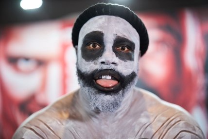 Усик - Чисора: онлайн-трансляция бояБританец пришел на взвешивание в образе к завтрашнему празднику - Хэллоуину. Дерек своим внешним видом попытался запугать украинца. Александр был более дисциплинирован и появился на мероприятии в маске.