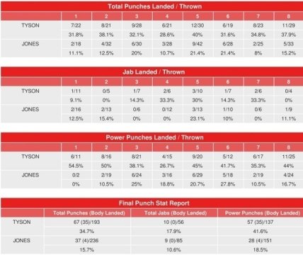 Майк хоть и выбросил меньше ударов, чем 51-летний "Супермен", зато был намного точнее по количеству попаданий, значительно превзойдя Роя. За 16 минут противостояния (8 раундов по 2 минуты, - прим. ред.) Тайсон выбросил 193 удара, 67 из которых попали в цель (точность 34,7%). Джонс исполнил 236 удар, 37 из которых были точными (15,7% ).