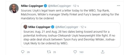 По информации источника, команда украинца, который является обязательным претендентом на титул WBO, отослала письма всем заинтересованным сторонам для прояснения ситуации. Коппинджер отмечает, что Усик получит чемпионский бой с Джошуа, если чемпион WBC Тайсон Фьюри не сможет договориться с Деонтеем Уайлдером об отсрочке третьего поединка.