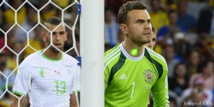 Сборная Алжира забила гол с углового после ошибки Акинфеева на выходе, когда ему несколько раз светили в глаза лазерной указкой.