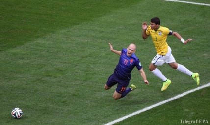 На 80-й минуте судья отплатил бразильцам, не назначив пенальти за толчок Роббена в штрафной площади Пентакампеоне.