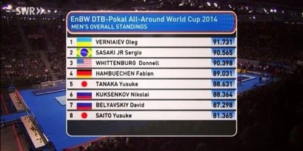 В сумме шести упражнений украинец набрал 91.731 балла. На втором месте финишировал бразилец Серхио Сасаки - 90,565 балла, на третьем - американец Доннел Виттенбург (90,398).