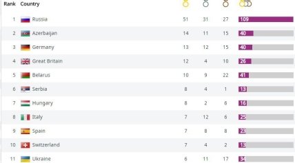 Лидером общекомандного зачета по-прежнему является сборная России, на счету которой 109 наград - 51-31-27. На втором месте команда Азербайджана (14-11-15, 40), на третьем - Германии - 13-12-15 (40).