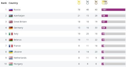 Лидером медальной таблицы по-прежнему является сборная России, на счету которой 161 награда - 78-40-43. На втором месте хозяева Игр из команды Азербайджана - 21-15-20, 56, на третьем - команда Великобритании - 18-10-19, 47.
