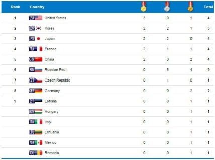 По общему количеству наград первыми идут – россияне (9), вторые – южнокорейцы (5), третье место между собою поделили сразу 4 сборные - США, Япония, Франция и Китай (у всех по 4 медали).