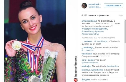 Справка: Анна Ризатдинова - украинская спортсменка, художественная гимнастка, чемпионка мира по упражнению с обручами (2013), многократный призер чемпионатов мира и Европы, других международных турниров.
