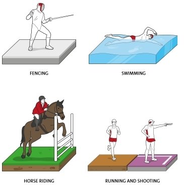 М Плавание, вольный стиль М Фехтование на шпагах М Верховая езда, конкур М Бег и стрельба из пистолета М Церемония награждения |