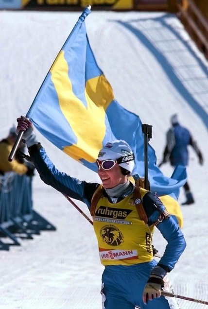 Справка: Магдалена Форсберг — выдающаяся шведская биатлонистка и лыжница. Шестикратная чемпионка мира по биатлону. Единственная в мире 6-кратная обладательница Кубка мира по биатлону и 17-кратная обладательница малого Кубка мира в различных биатлонных дисциплинах. Бронзовый призёр Олимпийских игр. Завершила карьеру после сезона 2001—2002 г. непобеждённой, завоевав не только большой Кубок мира, но и все четыре малых Кубка.
