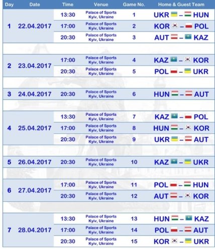 Календарь матчей чемпионата мира по хоккею в дивизионе ІА, который пройдет в Киеве с 22 по 28 апреля 2017 года.