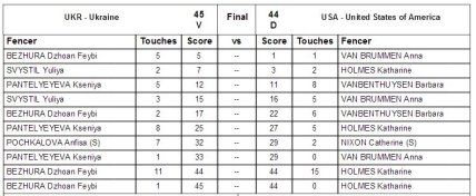 В финале украинские шпажистки всего на один укол превзошли сборную США (45:44). Также на пути к золотой награде украинская команда в составе Ксении Пантелеевой, Анфисы Почкаловой, Фейби Бежури и Юлии Свыстил разобралась с командами Японии (45:26), Швейцарии (45:33) и Польши (45:38).