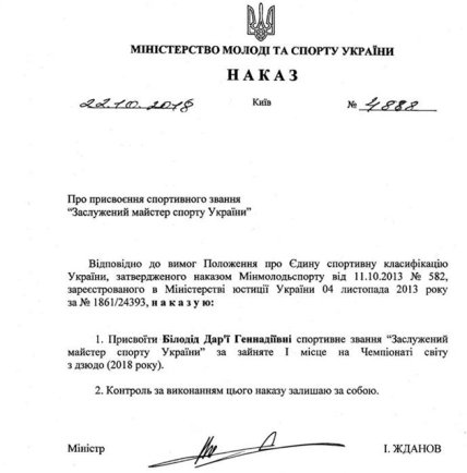 "Давайте поздравим нашу чемпионку и гордость Дарью Белодед с присвоением звания "Заслуженный мастер спорта Украины". Приказом Министра молодежи и спорта Украины Игоря Жданова от 22 октября 2018 года Дарье Белодед присвоено высшее спортивное звание "Заслуженный мастер спорта Украины". Поздравляем", - говорится в сообщении.