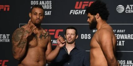 В его главном событии встретятся полусредневесы Рафаэл дос Аньос и Леон Эдвардс. В преддверии противостояния бойцы прошли официальную церемонию взвешивания, по её итогам спортсмены показали одинаковый вес — 77,5 кг.
