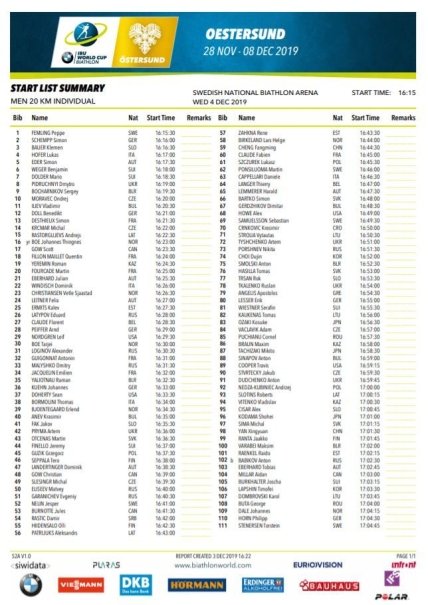 В среду, 4 декабря, в шведском Эстерсунде пройдет индивидуальная мужская гонка Кубка мира по биатлону.