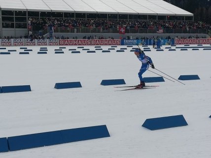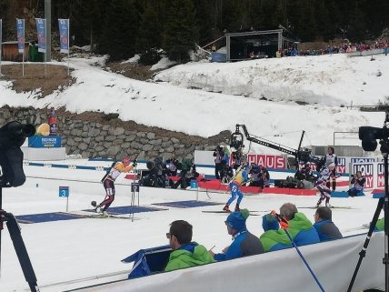 В 14-ти секундах впереди маячил желтый биб Доротеи Вирер – еще одной героини чемпионата. Думается, по окончании турнира земляки итальянки, родившейся в паре десятков километров от места проведения чемпионата, должны задуматься о прижизненном памятнике Доро у входа на стадион ) А может быть, и переименовать арену в ее честь ) Еще одним аргументом в пользу этого могло стать золото масс-старта – третье для Вирер на чемпионате, но…