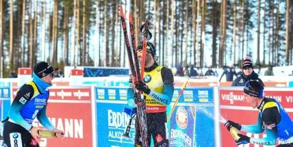 Французские биатлонисты уронили соотечественника, Мартена Фуркада, когда качали его после победы в гонке преследования на этапе Кубка мира в Контиолахти (Финляндия).