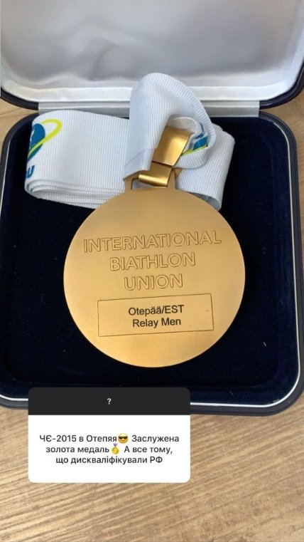 Украинский биатлонист Дмитрий Пидручный рассказал, что Международный союз биатлонистов (IBU) прислал ему золотую медаль за победу в эстафете на чемпионате Европы по биатлону 2015 года. Соответствующее фото спортмен опубликовал в «сториз» своего «инстаграма».
