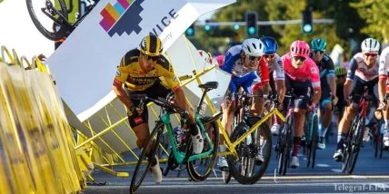 На финише первого этапа в финишном створе за победу боролись несколько десятков спортсменов, в частности и голландцы Дилан Груневеген (Jumbo-Visma) и Фабио Якобсен (Deceunicnk Quick Step).