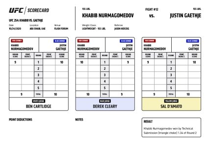 Судейский счет в бою Хабиб Нурмагомедов - Джастин Гейджи: