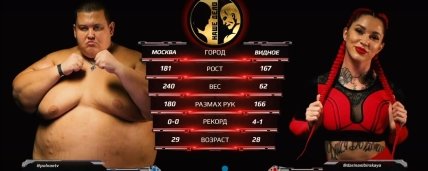 На этой неделе поп-лига ММА "Наше дело" провела ивент в Москве, главным событием которого стал "первый в мире поединок между мужчиной и девушкой" Гриша "Полное ТВ" - "Красная королева" Дарина Маздюк. Именно под таким соусом продавалось шоу. Отметим, вес Григория составляет 240 кг, а его соперницы - 62 кг.