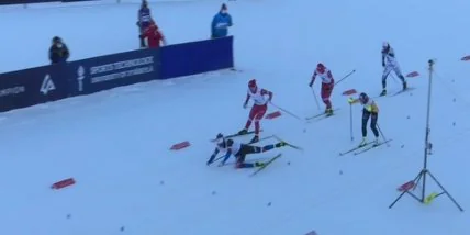 Российские лыжники сбили друг друга на финише в борьбе за медаль (видео)Во время спринта классическим стилем в финишном створе россиянка задела лыжу лидирующей чешки Терезы Берановой, что привело к падению спортсменки. В итоге Анастасия перестроилась в другой "коридор" и выиграла гонку. Правда, жюри приняло решение наказать Фалееву за нарушение правил и добавило к ее результату 2 минуты, отбросившие представительницу РФ на последнее место.