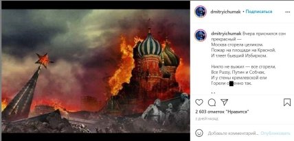 Украинский тяжелоатлет, новоиспеченный чемпион Европы в весовой категории до 109 кг, Дмитрий Чумак рассказал, что побудило его опубликовать пост в Instagram, на котором изображен коллаж с горящим Кремлем. По словам спортсмена, таким образом он потроллил Кремль, развязавший военный конфликт в Украине, в результате которого погибли тысячи украинцев.