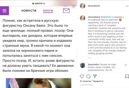Олимпийская чемпионка Баюл усмотрела плагиат в наряде россиянки Загитовой (фото)В российской прессе растиражировали информацию о том, что Баюл якобы "вела себя как дикарка, которая впервые увидела мир". Кроме того, в блоге говорится, что фигуристка "залезла на чернокожего парня и попыталась заняться с ним сексом". Баюл с улыбкой отреагировала на данную публикацию в РосСМИ, отметив, что в следующий раз они представят ее как пришельца из космоса.