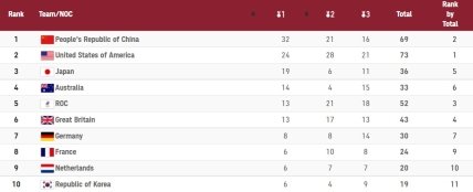 Медальный зачет Олимпиады-2020 по итогам 11-го соревновательного дня (топ-10):